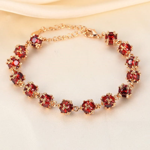 Brightly hued, this zircon bracelet is crafted in 18k gold plated metal and features natural-colored, fine cubic gemstones in a flexible rope design. 4 stone colors are available: green, blue, red, and white.