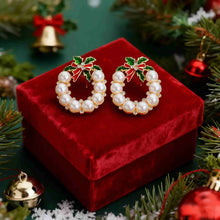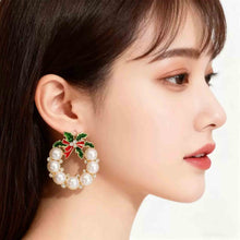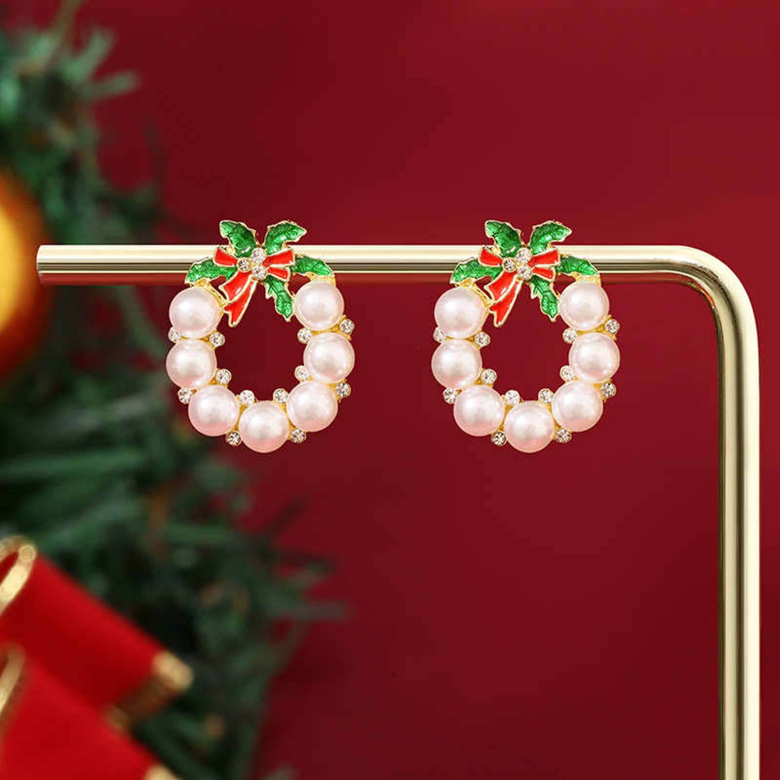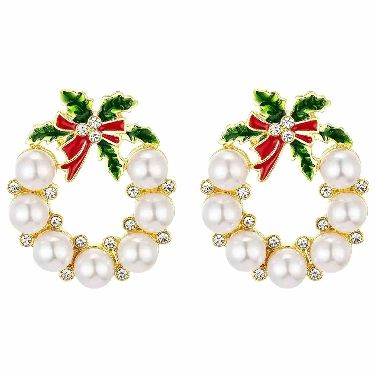 Big Christmas Wreath Earrings Eye-catching Xmas Pearl Earring Studs with Silver Pin