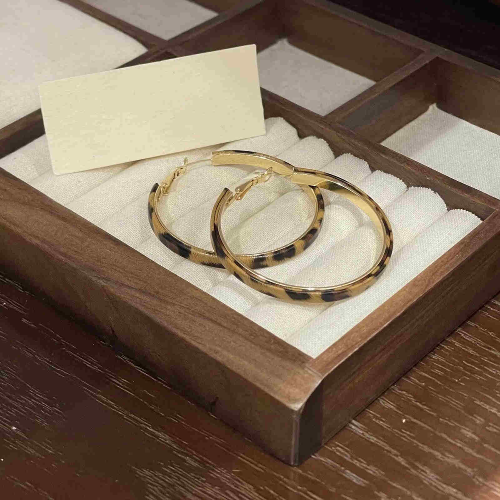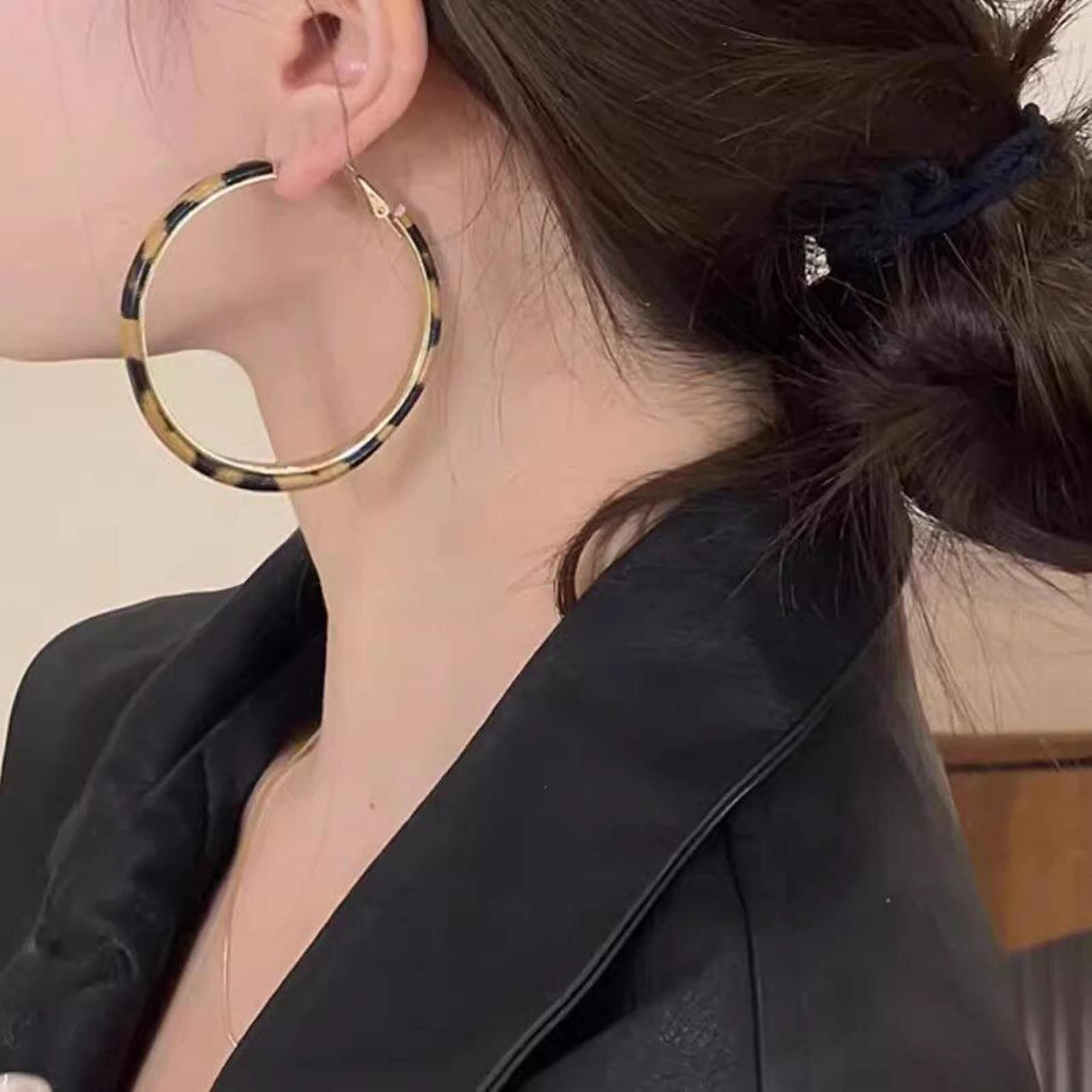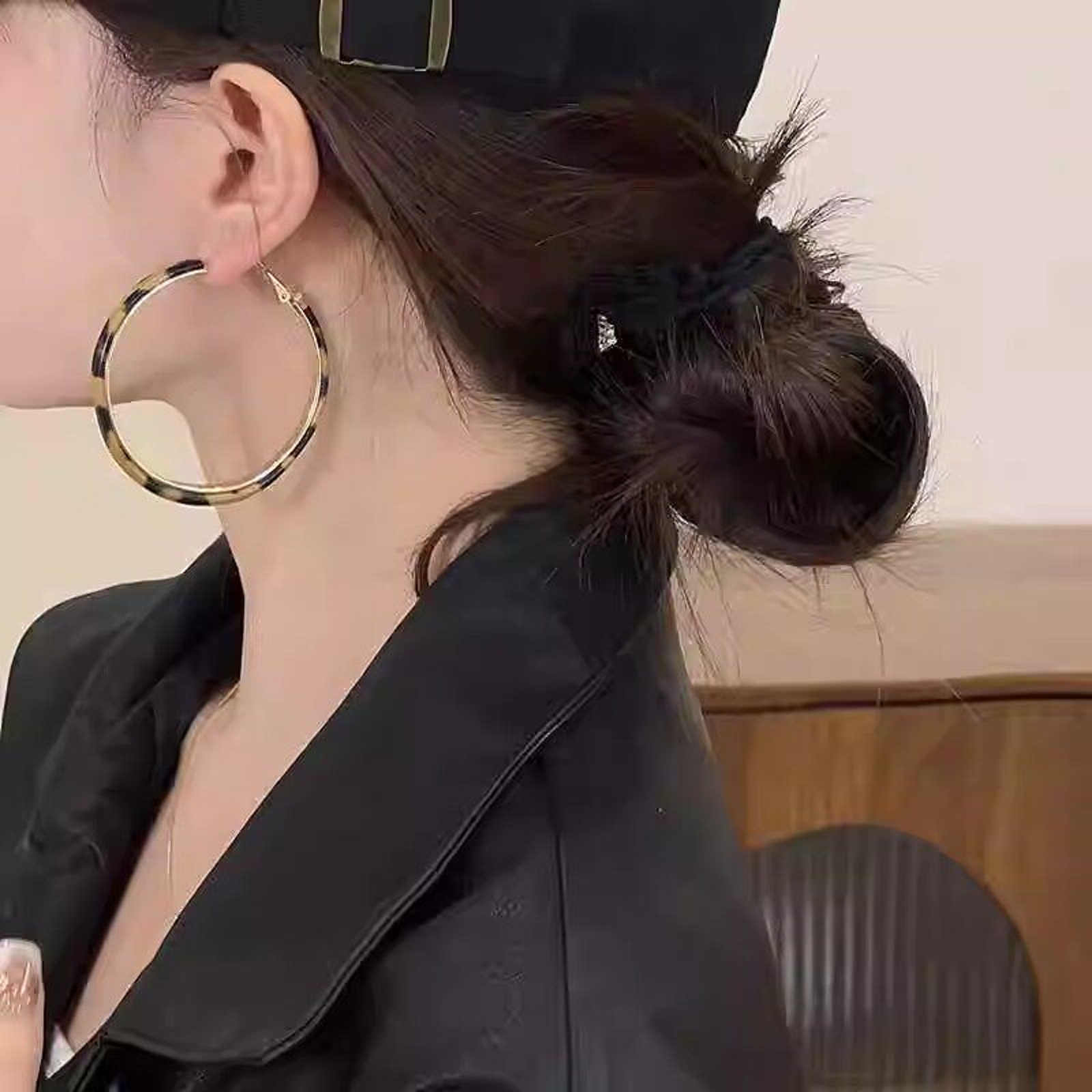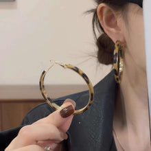 These are a pair of statement leopard print hoop earrings suitable for all seasons. The hoops are 4.0cm in diameter, perfectly complementing the bold leopard print. The leopard print is made of eco-friendly resin, ensuring a shiny finish that won't fade. The metal parts are plated with 14K gold, giving the earrings an overall urban retro vibe.