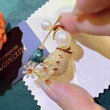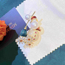 A luxury freshwater pearl Christmas brooch. Designed as a snowman shoveling snow, this cute xmas brooch is ready to bring luck to your every Christmas holiday.