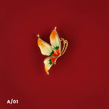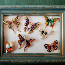 - ORNATE VINTAGE INSPIRED BUTTERFLY. A large art nouveau inspired butterfly brooch made from mixing enamel paint, colored crystal rhinestones, and aurora borealis stones. The decorations lay against a brushed metal outline that gives the illusion of a worn antique estate heirloom piece. Approximately 3 inches wide.