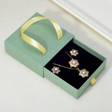 A pair of pearl and diamond earrings, a pearl diamond ring, and a pearl pendant are all included in this set. All pieces are 18K gold plated and made of 8-10 mm black green freshwater pearls. At a good price, this is one of the most attractive real pearl jewelry sets on the market.