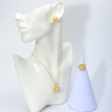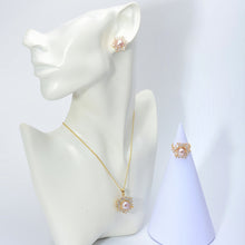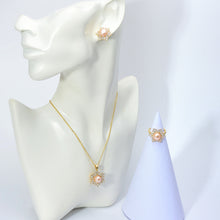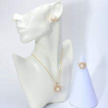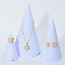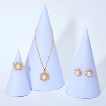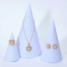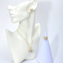 The set contains pearl diamond earrings, a pearl ring, and a pearl pendant