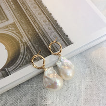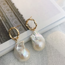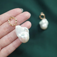 A real pearl and gold clasp is a classic combo in jewelry design. This pair of big baroque pearl earrings feature 14k gold settings. The gold clasp holds an irregular round shape, which matches the unique shape of a baroque pearl.
