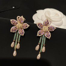 Inspired by the delicate beauty of violet flowers, these crystal flower earrings feature five petals made of sparkling rhinestones and three dangling drops. The design of rhinestone earrings exudes a romantic and luxurious style that is perfect for formal occasions such as weddings, galas, and dances.