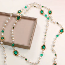 Green Crystal and Shell Pearl Long Necklace Glass and Pearl Dress Chain Sweater Chain