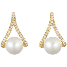 Con un diseño en forma de triángulo, este par de aretes de perlas y diamantes demuestran plenamente la belleza de la geometría. En el medio del triángulo, se encuentra una perla de concha blanca brillante de 8 mm. Y todo el cuerpo de los aretes de perlas está decorado con diamantes y las partes metálicas están todas chapadas en oro de 14 quilates. Las líneas suaves y el diseño moderno de los aretes colgantes de perlas pueden realzar su apariencia en poco tiempo.